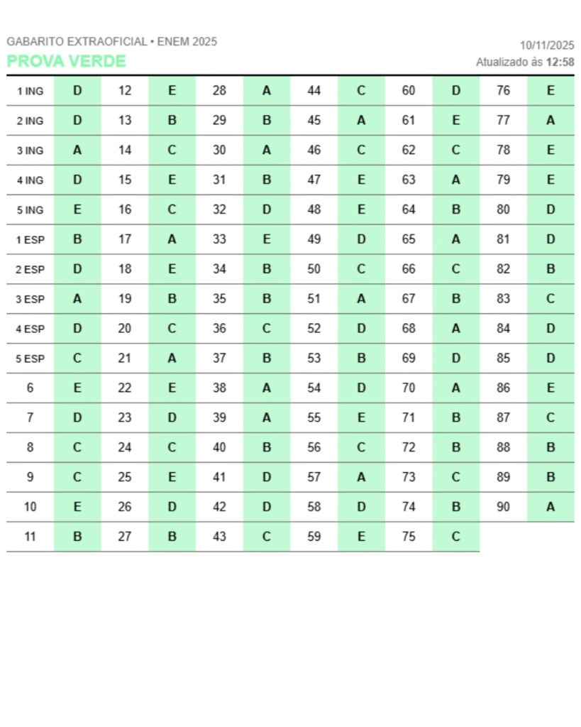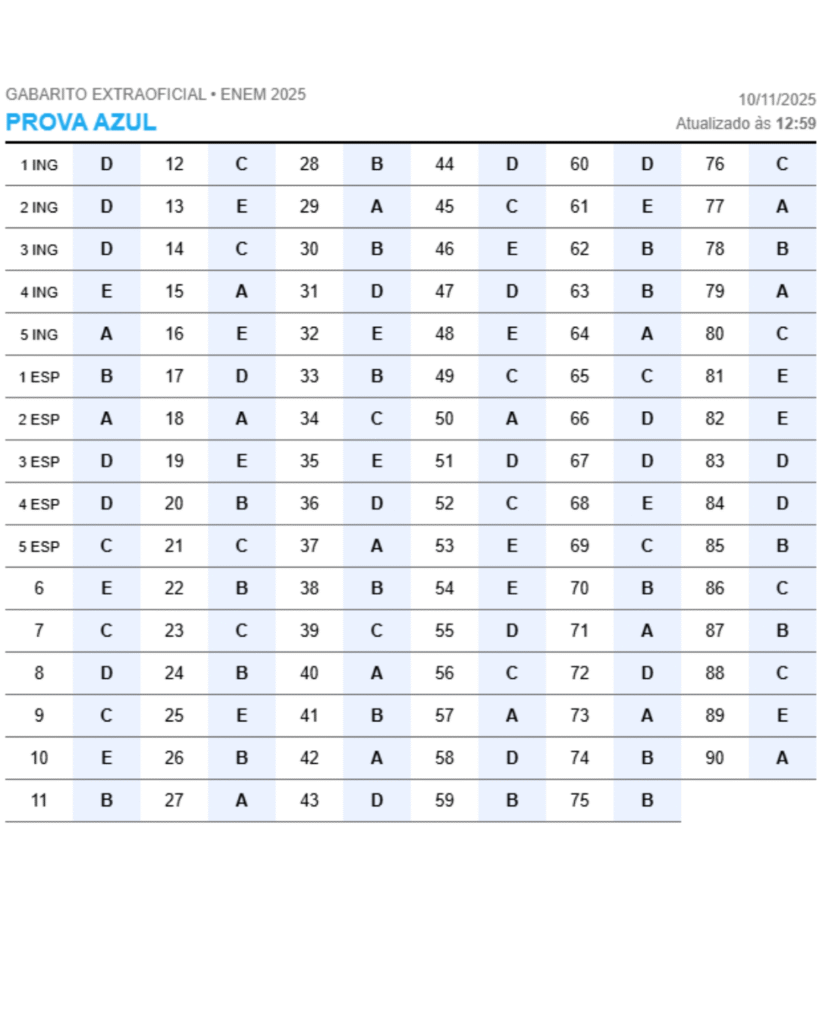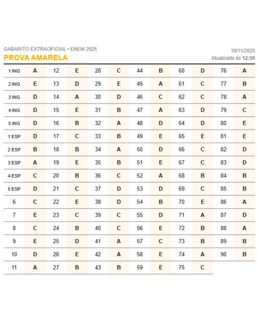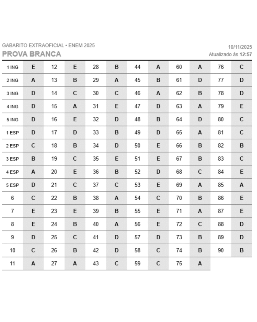 O gabarito extraoficial do Enem 2025 já pode ser consultado após a realização do primeiro dia de exame, neste domingo (9). A correção foi elaborada por professores especializados, que analisaram as provas e comentaram as questões em transmissão ao vivo durante a noite.