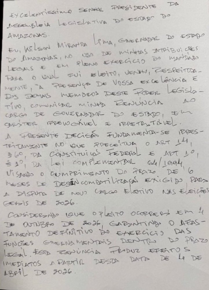 O cenário político do Amazonas mudou drasticamente em poucas horas. Após meses indicando que permaneceria no cargo até o fim do mandato, Wilson Lima surpreendeu ao oficializar sua renúncia no último dia do prazo legal para desincompatibilização.